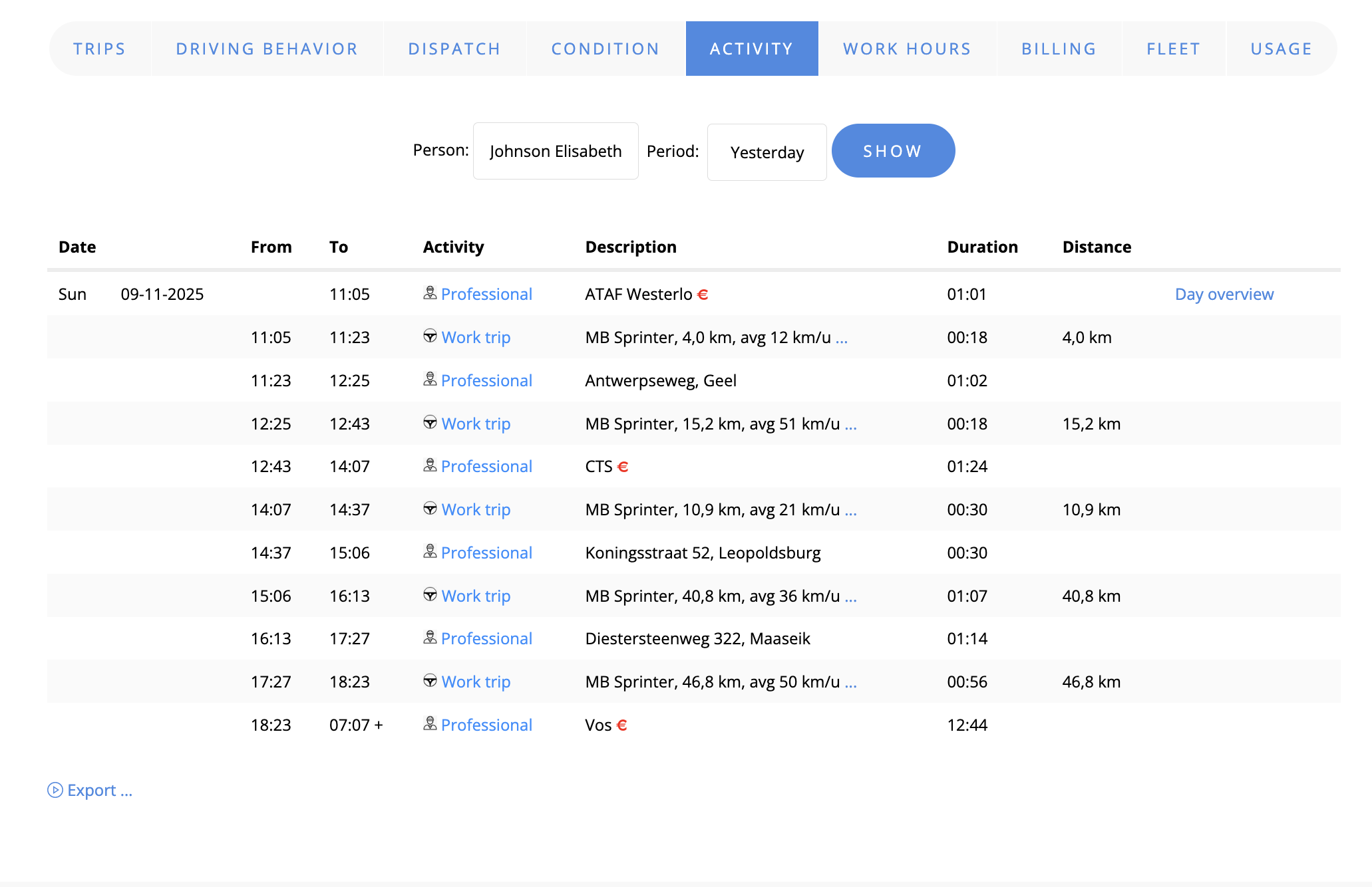 The activity report provides an overview of a full day for a person including all trips, stops, idling, locations, etc. A useful tool to monitor the work performed by mobile employees and to improve the data where necessary for the working hours report and the mobility allowance.